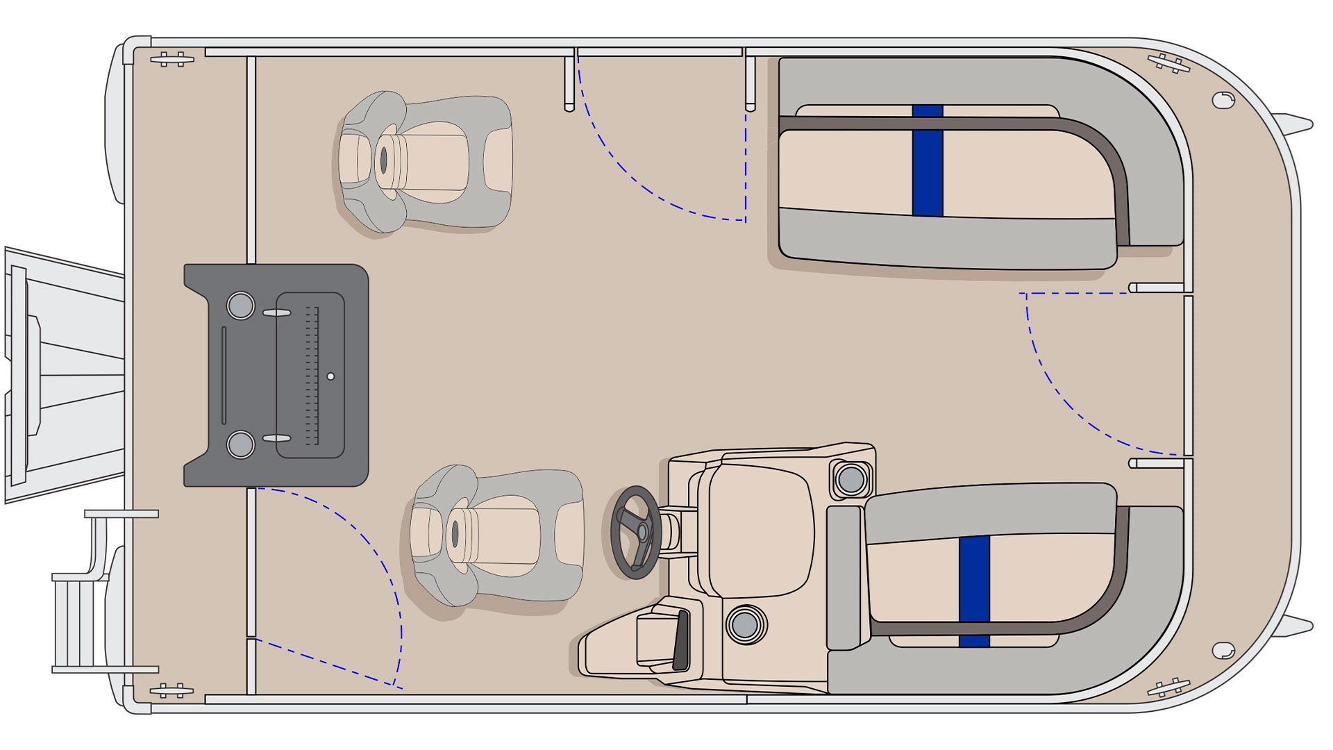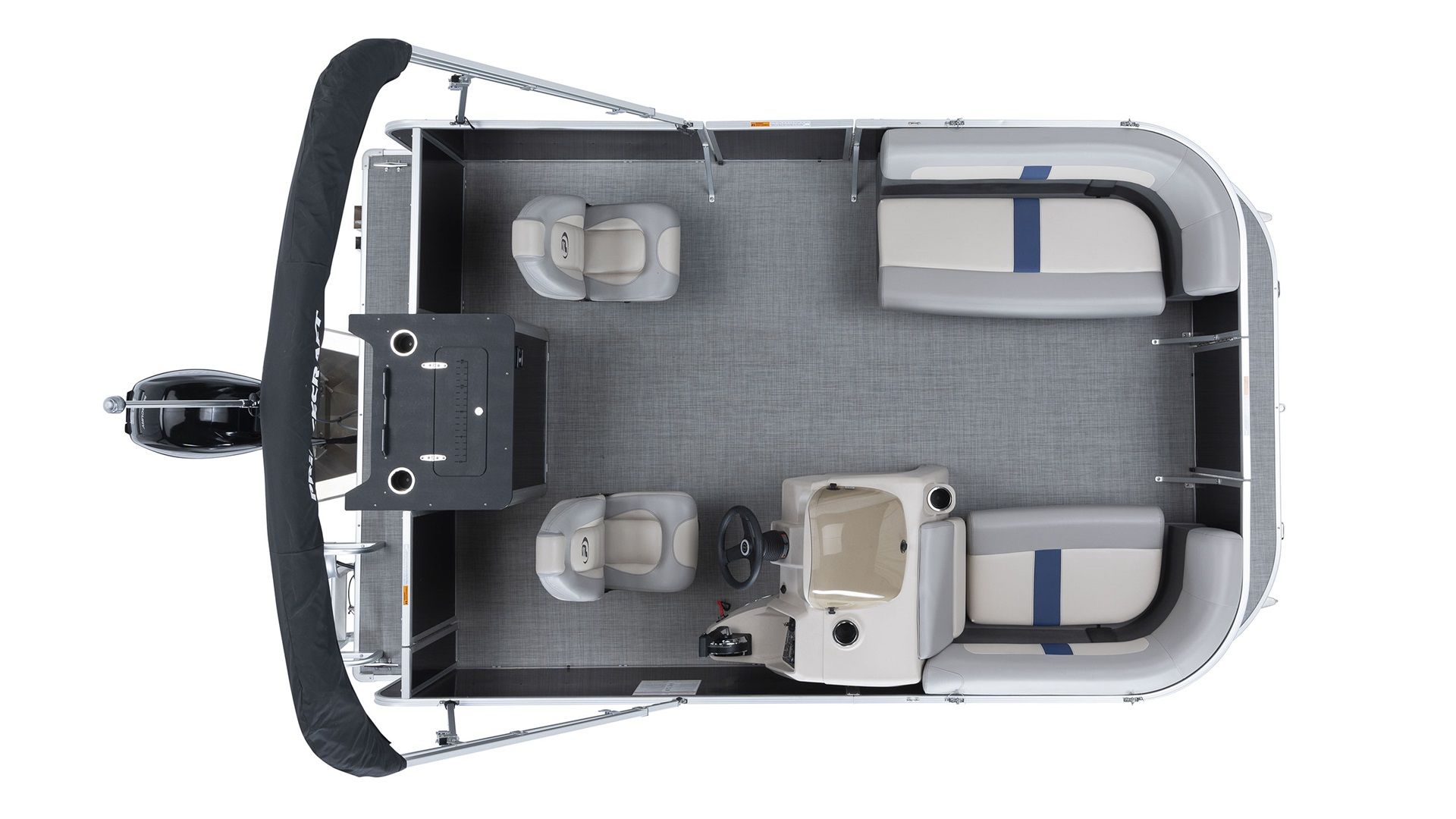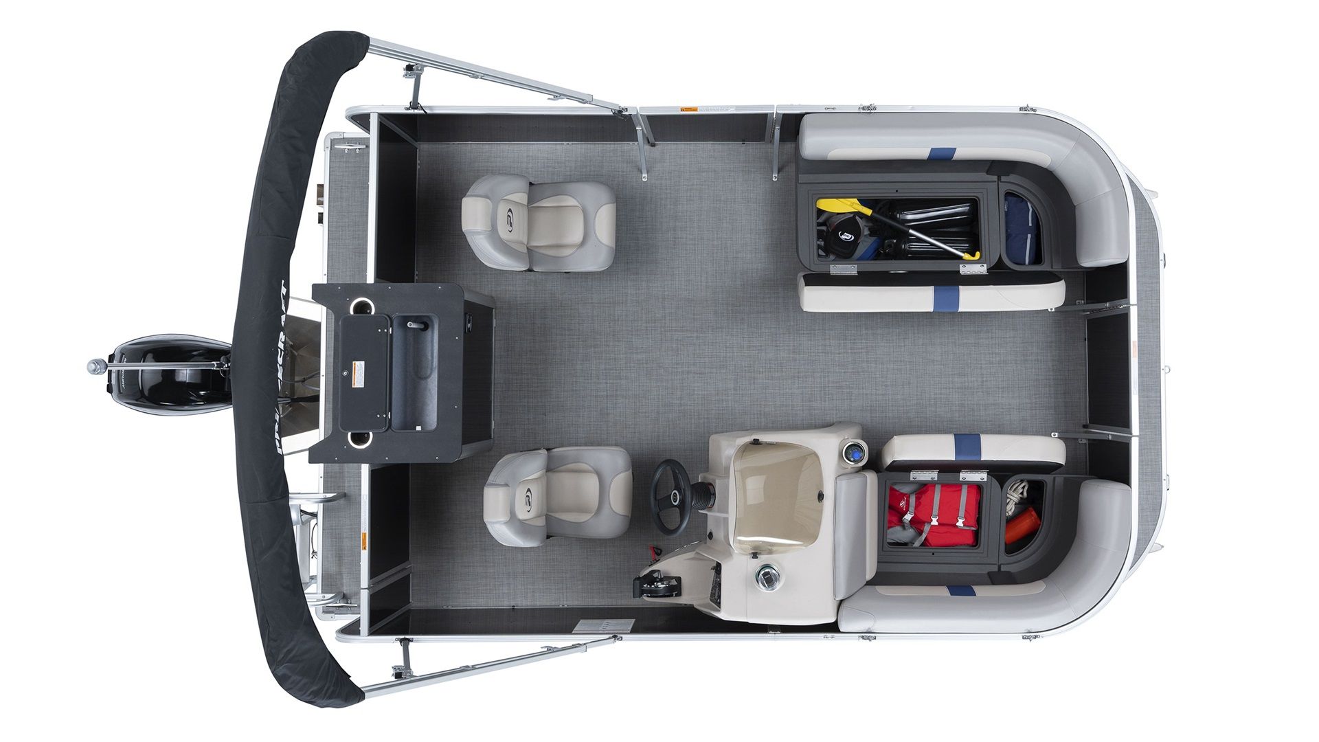 Cloaked in select dark grey vinyl flooring that mirrors the opulence of teak, the Jazz 14-2RS 2025 exudes sophistication. Its anodized aluminum rails and full-length pontoon skirting echo durability while presenting a sleek profile.
