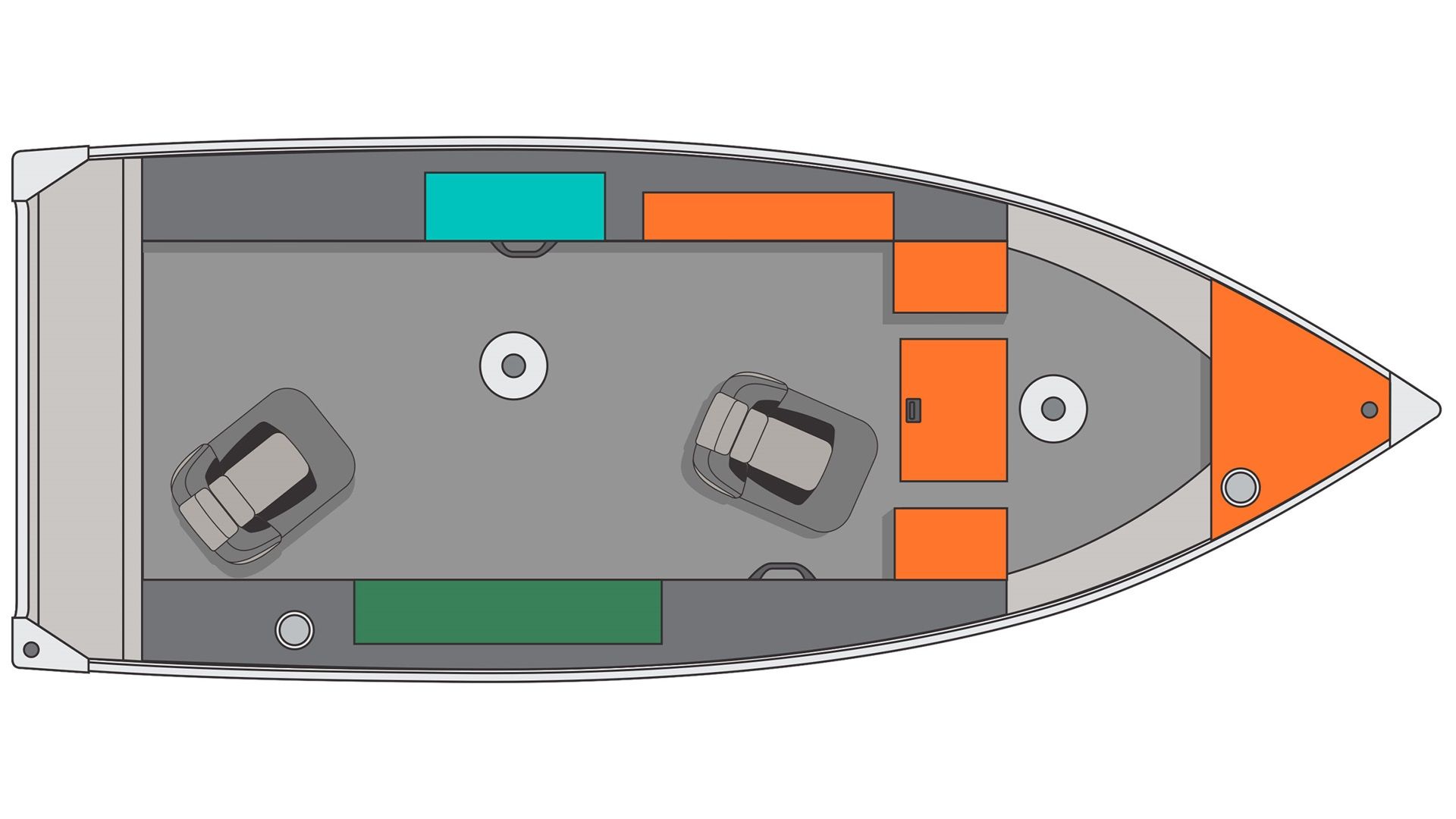 Step aboard to find a layout optimized for both comfort and fishing functionality. The deck, covered with anti-skid marine-grade vinyl and premium carpeting, offers uncompromised safety and comfort underfoot. The boat includes two folding seats with no-pinch hinges, strategically placed to maximize fishing space and effectiveness.