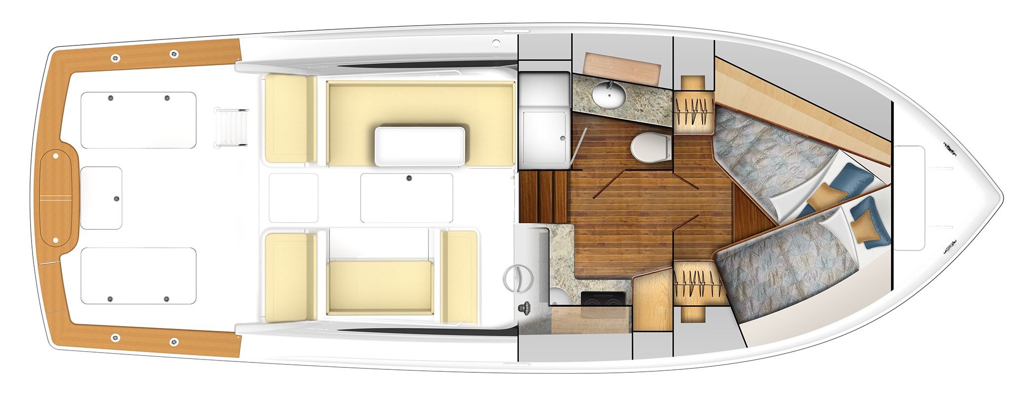 Sportfishing enthusiasts will revel in the 38 Billfish’s array of specialized features. Its 109 square-foot cockpit is outfitted with in-deck fish boxes, a bait freezer, a live well, and tackle storage — all designed to enhance your fishing experience. The walk-through transom door and lift gate, coupled with the rocket launcher and optional fighting chair, underscore the model’s angler-focused design.